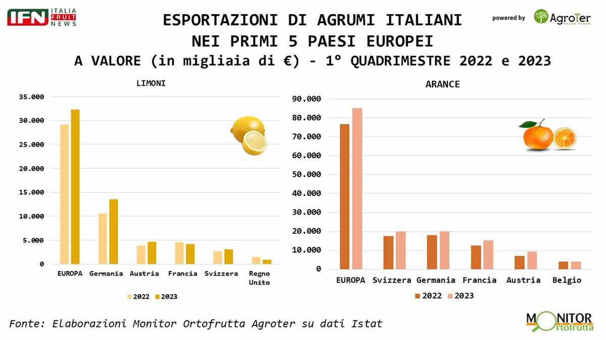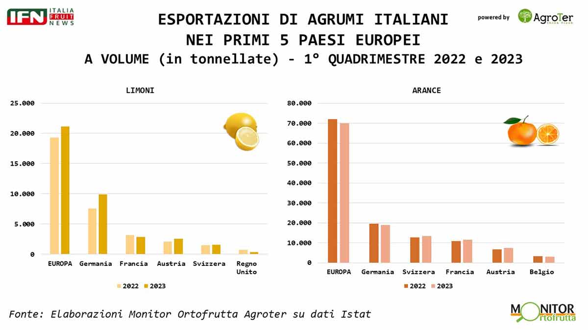Passando all’analisi degli Agrumi, con focus su arance e limoni, Germania, Austria, Francia e Svizzera sono i mercati di destinazione più significativi, con l’aggiunta del Regno Unito per i limoni e del Belgio fra le arance.