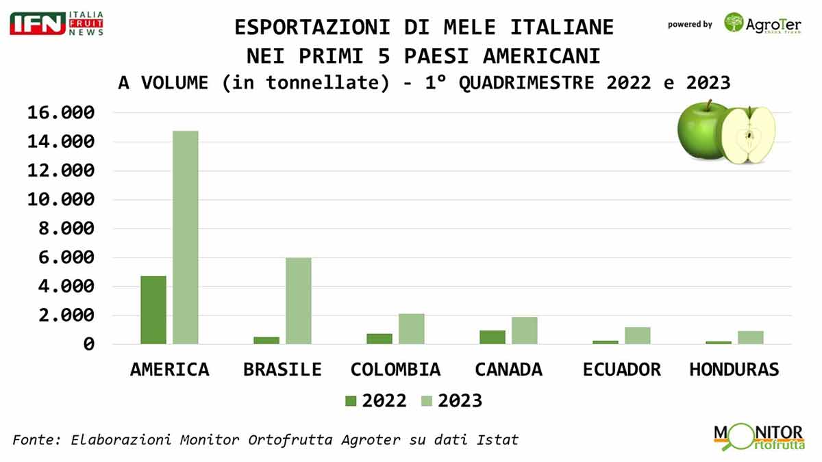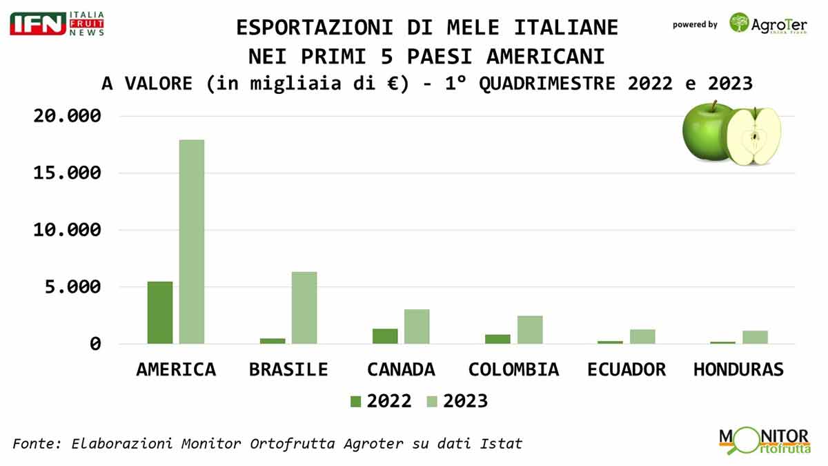 Chiaramente siamo ben lontani dalle performance del vecchio continente, ma c’è sicuramente potenziale da esplorare, vista l’eterogeneità delle prime cinque nazioni: Brasile, Canada, Colombia, Ecuador ed Honduras. Parallelamente, non vendiamo un chilo di mele in USA, Messico e Argentina a dimostrazione di come ci siano margini di crescita importanti.