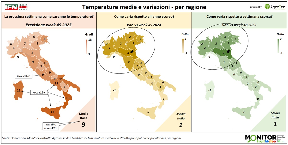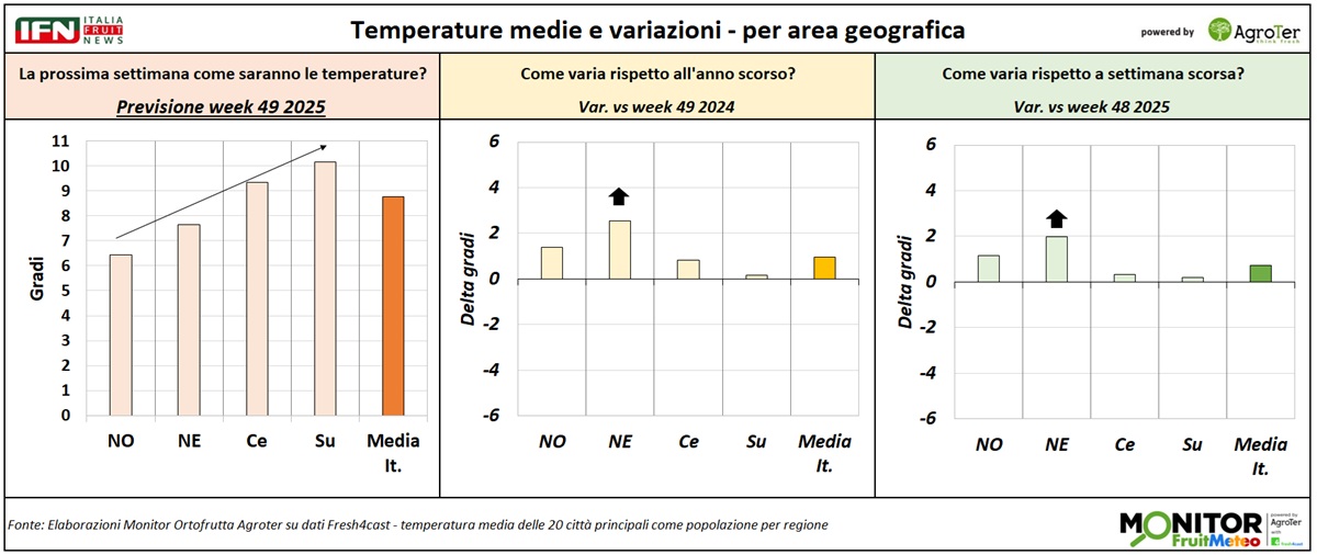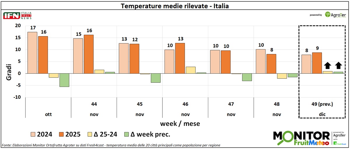 Si interrompe il progressivo raffreddamento osservato dalla settimana 45: nella week 49 le temperature medie tornano a salire, risultando più elevate sia rispetto alla settimana 48 sia allo stesso periodo del 2024.