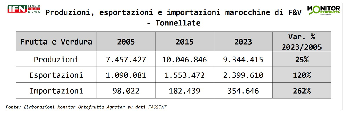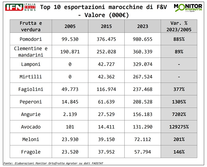 È evidente, come in vent’anni il Marocco abbia compiuto un vero salto di qualità, passando da esportatore regionale a protagonista riconosciuto nei mercati europei grazie a una strategia chiara: puntare da un lato su prodotti ad alto valore come avocado, frutti di bosco e pomodoro e, dall’altro lato, con prodotti con i quali può competere per l’ottimo rapporto qualità prezzo (vedi meloni, angurie e drupacee). Un percorso di crescita costante che conferma il Marocco come uno dei poli più competitivi e dinamici del Mediterraneo, sempre più orientato all’export e capace di rispondere rapidamente alle richieste del mercato europeo, anche in termini di prodotto certificato.