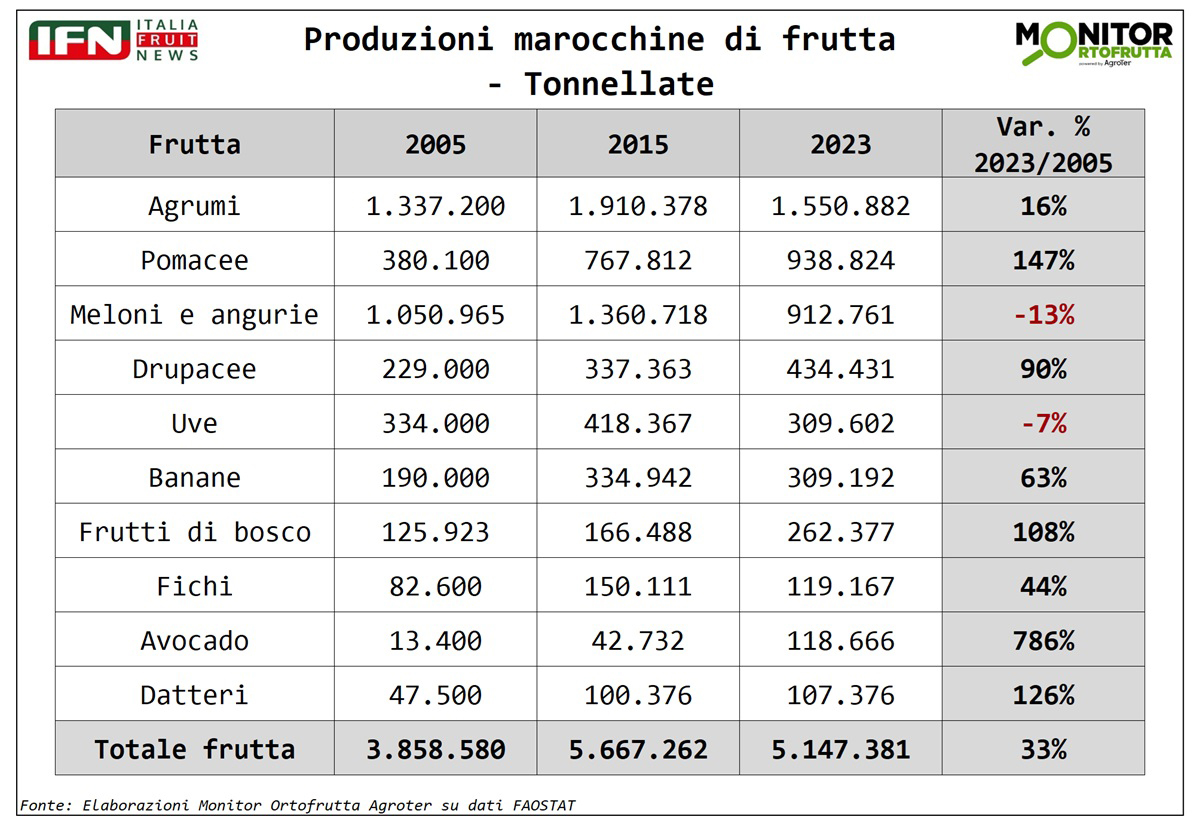Sul fronte produttivo frutticolo c’è stata una crescita del 33% in circa 20 anni, trainata da Avocado (+ 786%), pomacee, in particolare mele (+147%), datteri (+126%) frutti di bosco (+108%) e drupacee (+90%). Più stabile, invece, la situazione per gli agrumi (+16%), dove si segnala un calo marcato della produzione di arance, compensato da un aumento di mandarini. Infine si registrano lievi diminuzioni per meloni, angurie e uva da tavola. Nel complesso, la produzione di frutta è passata da meno di 4 milioni a una media annua di oltre 5 milioni di tonnellate, con agrumi, pomacee e meloni che rappresentano oltre il 66% del totale.