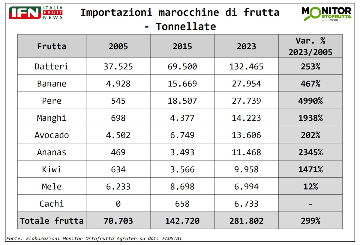Sul versante delle importazioni, il quadro mostra un cambiamento di mentalità. La crescita di quasi il 300% è in particolar modo dominata dalla frutta (che vale l’80%) ed indica come il Marocco stia diventando anche un mercato sempre più aperto e diversificato. I datteri restano un prodotto simbolo della cultura alimentare nazionale: la produzione interna è raddoppiata, ma il Paese continua a importarli da Egitto, Emirati Arabi, Tunisia e Algeria. Parallelamente, cresce il consumo di banane, sostenuto da un forte aumento della produzione locale, mentre l’import di mango, ananas, cachi e kiwi testimonia la curiosità dei consumatori marocchini verso nuovi sapori tropicali. L’avocado, inoltre, è ormai entrato stabilmente nella dieta nazionale, con importazioni nei mesi in cui la produzione domestica è assente (da aprile a settembre).