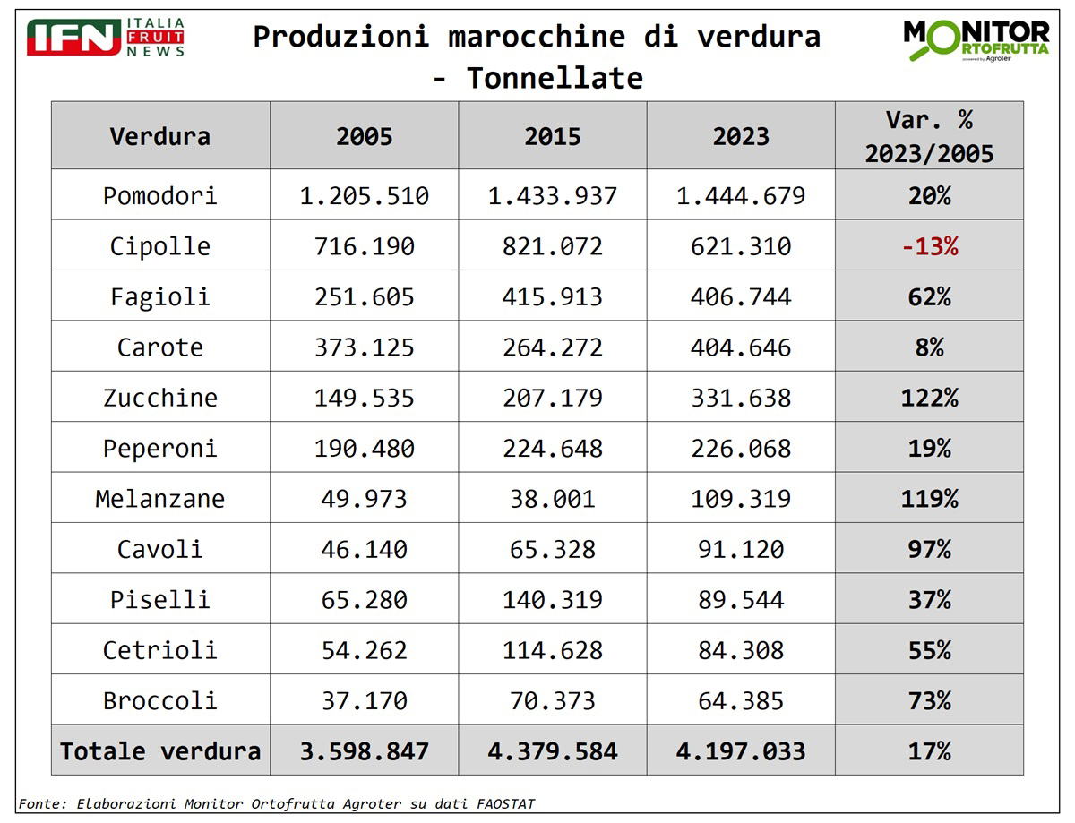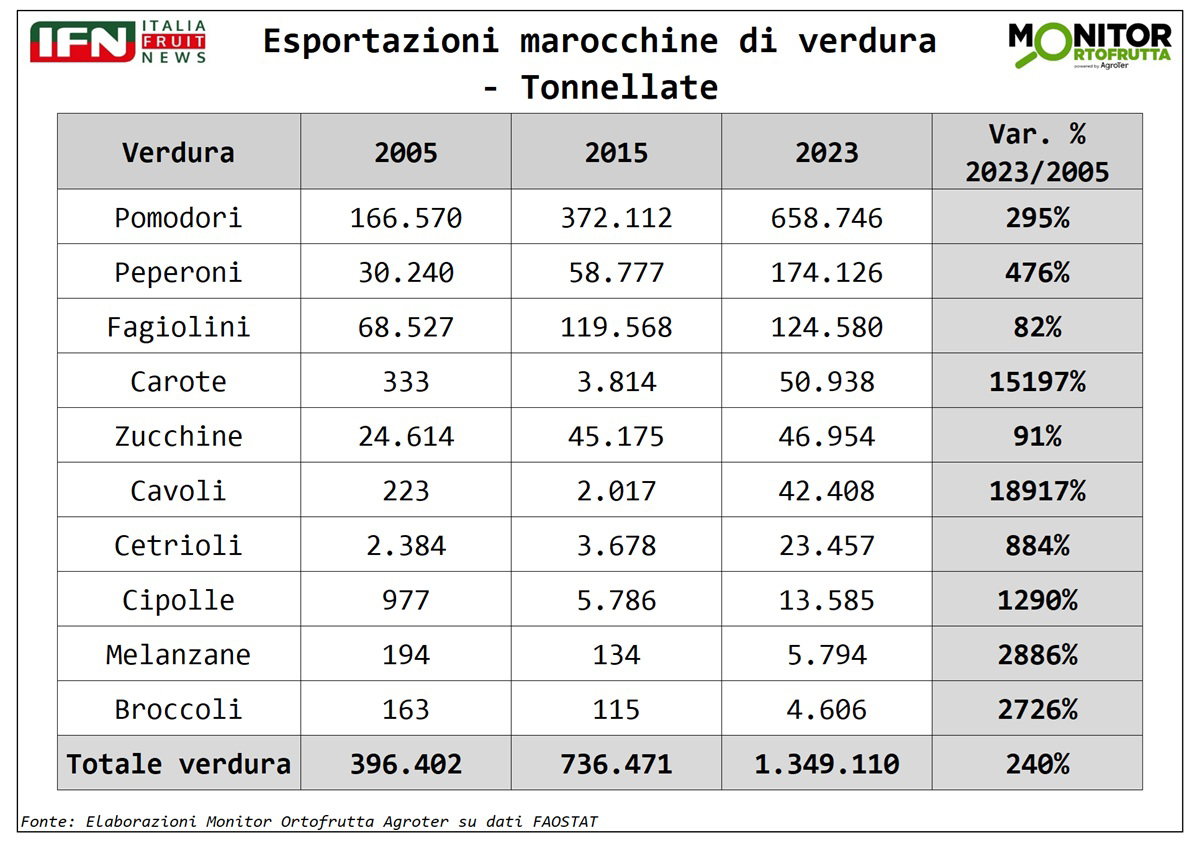 I pomodori, vero pilastro dell’export marocchino, rappresentano quasi il 50% delle esportazioni complessive a volume di ortaggi, e sono quadruplicate in vent’anni superando 600 mila tonnellate. Seguono peperoni e fagiolini, che insieme valgono il 22%. Tutti i prodotti mostrano comunque una crescita sostenuta, con un incremento complessivo del 240% negli ultimi anni.