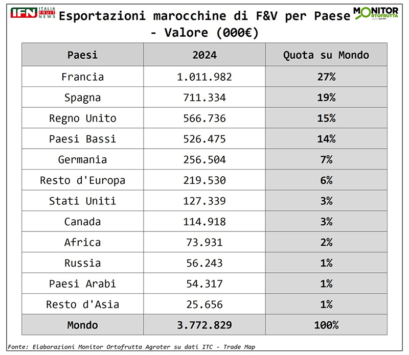 Il dato economico complessivo parla chiaro: il valore delle esportazioni marocchine di frutta e verdura è cresciuto del 500% in vent’anni, passando da 625 milioni di euro a 3,772 miliardi di euro. Le principali destinazioni restano europee: Francia e Spagna assorbono insieme il 46% delle spedizioni, seguite da Regno Unito e Paesi Bassi con il 29%. Le esportazioni verso Stati Uniti e Canada riguardano prevalentemente agrumi, mentre complessivamente l’Europa rappresenta l’88,8% dell’export ortofrutticolo marocchino, le Americhe il 6,4%, l’Africa il 2%, i Paesi arabi l’1,4% e l’Asia appena lo 0,7%.