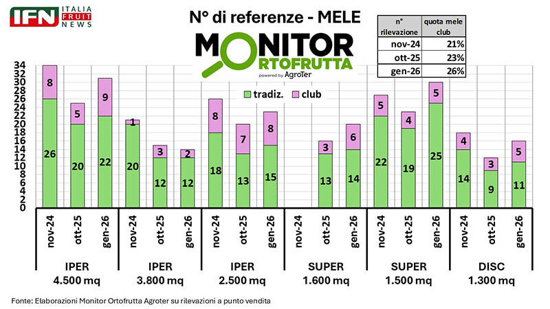 Da queste premesse è partita anche l’analisi dello scaffale: “Nelle rilevazioni condotte nei giorni scorsi nel Nord Italia, confrontate con quelle degli anni precedenti e su diversi format distributivi, troviamo oltre 30 referenze di mele sia in un ipermercato da 4.500 metri quadrati sia in un supermercato da 1.500. Le insegne con politiche di assortimento più contenute sono pochissime. Anche il discount, pur con superfici ridotte, presenta una segmentazione marcata».