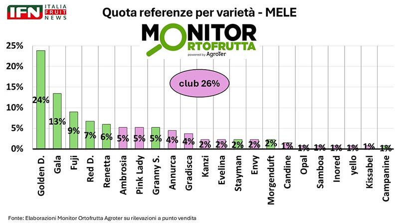 Nel dettaglio dell’assortimento, ha aggiunto Della Casa, “le varietà tradizionali rappresentano il 74% delle referenze complessive: la Golden da sola vale ancora il 24% e, insieme a Gala e Fuji, porta le tre principali varietà attorno al 50%. Ma il 26% è ormai composto da referenze club, dalla più nota Pink Lady a molte altre, fino a varietà fortemente territoriali. Un’offerta così ampia e profonda deve essere necessariamente categorizzata e organizzata con attenzione, altrimenti rischia di diventare poco leggibile per il consumatore”.