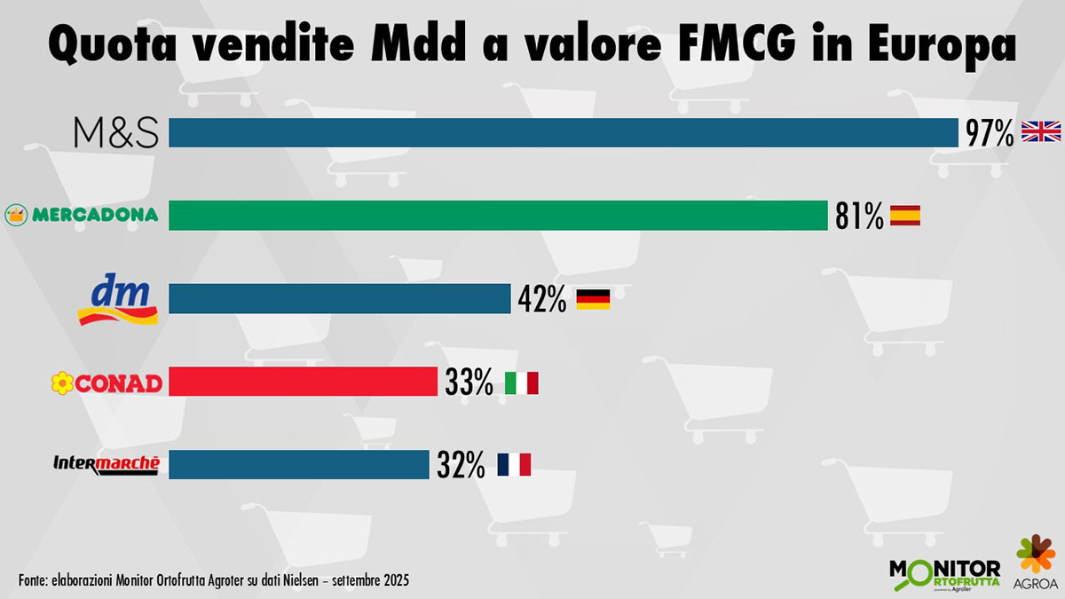 Ma cosa rende così distintivo il modello Mercadona? Innanzitutto, la capacità di anticipare i tempi: fu tra le prime aziende in Europa a sfruttare il potenziale dei codici a barre, molto prima che la Grande distribuzione organizzata ne comprendesse appieno l’utilità. In secondo luogo il format, che è standardizzato: supermercati tra i 1.300 e i 1.800 metri quadrati, situati in centri con più di 10.000 abitanti. Terzo: nessuna promozione ma sempre prezzi bassi “SPB - Siempre precios bajos”. Le poche attività promozionali oggi presenti riguardano esclusivamente i marchi dei produttori, mai i prodotti a marchio proprio, che nel frattempo sono cresciuti dal 30% del 2008 al 75% del 2024, tanto che nel 2025 Mercadona è il secondo player in Europa dopo Mark & Spencer per incidenza della Mdd sulle vendite (81%).