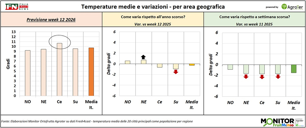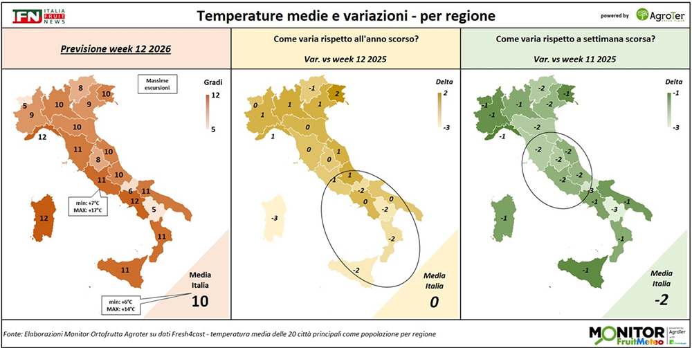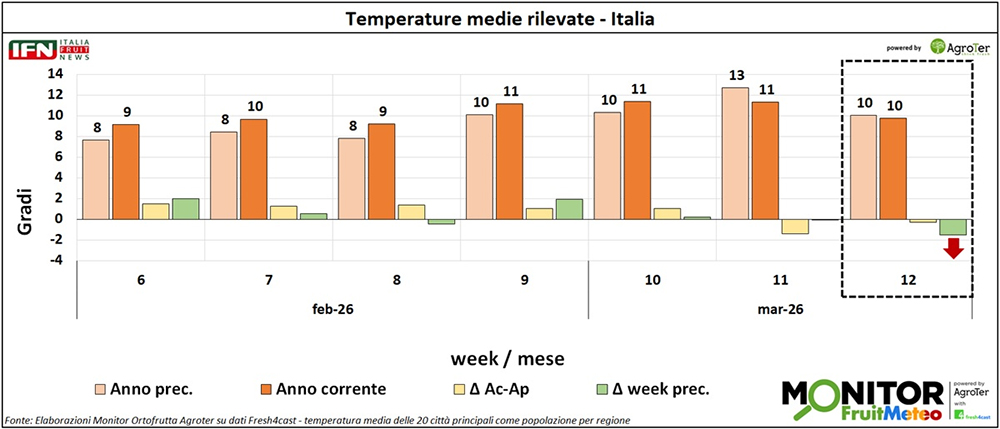 Le analisi del Monitor Ortofrutta si arricchiscono grazie a una nuova collaborazione dedicata a esplorare settimanalmente una variabile spesso decisiva per il settore ortofrutticolo: il meteo. Tra i diversi fattori che influenzano le condizioni climatiche, questa nuova rubrica si concentra in particolare sulle temperature medie registrate lungo la Penisola, con il supporto di Fresh4cast, una piattaforma software in cloud specializzata nella previsione della domanda e nell'ottimizzazione della supply chain per il settore ortofrutticolo.