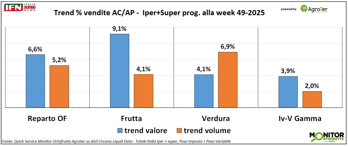 Dall’inizio dell’anno fino alla settimana 49, il reparto registra una crescita dei volumi del 5,2%, accompagnata da un incremento ancora più marcato del valore (+6,6%). Un risultato trainato soprattutto dall’aumento dell’euro-chilo della frutta e, in parte, dei prodotti di IV e V Gamma. La frutta cresce a volume del 4,1% ma mette a segno una performance decisamente migliore a valore (+9,1%), mentre i prodotti servizio avanzano del 2% in volume e del 3,9% a valore, beneficiando di un recupero dell’euro-chilo che negli ultimi anni era rimasto sostanzialmente stabile. La verdura contribuisce anch’essa alla crescita, ma con una dinamica opposta: i volumi aumentano in modo sostenuto (+6,9%), mentre il valore cresce più moderatamente (+4,1%). Le recenti dinamiche produttive, ripetutesi più volte nel corso dell’anno, confermano come il 2025 sia stato un anno in deflazione per il comparto orticolo.