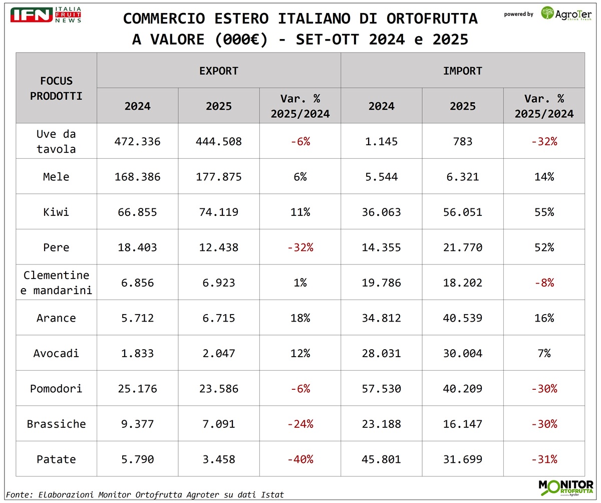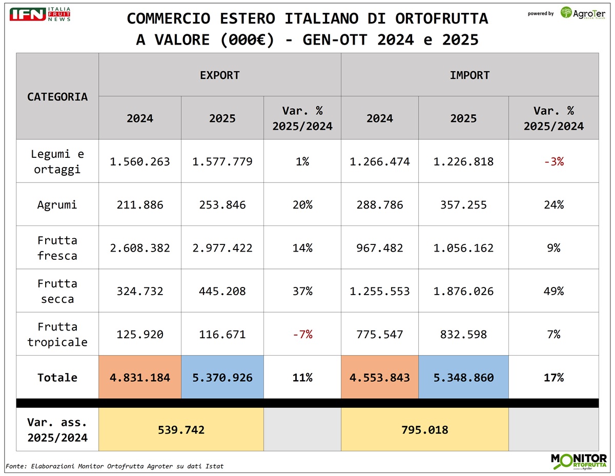 L’aggiornamento a ottobre 2025 del Monitor Ortofrutta Agroter su dati Istat conferma un copione che il punto di settembre aveva già lasciato intravedere: l’export italiano cresce e mostra una buona tenuta, ma l’import continua a correre con maggiore intensità, soprattutto in valore. È qui che la bilancia commerciale si “svuota”: non tanto per mancanza di spedizioni oltreconfine, quanto per il fatto che ciò che compriamo dall’estero pesa sempre di più sul conto economico.