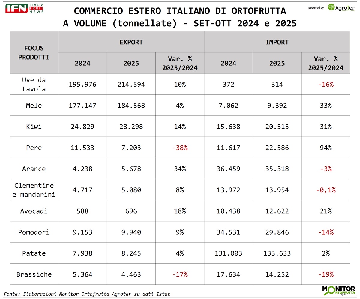 La fotografia più netta di difficoltà resta quella delle pere: l’export crolla (-38% a volume, -32% a valore) mentre l’import quasi raddoppia (+94% in volume, +52% a valore). Qui non ci sono sorprese: l’assenza di prodotto si fa sentire e i produttori oltreconfine ne approfittano.