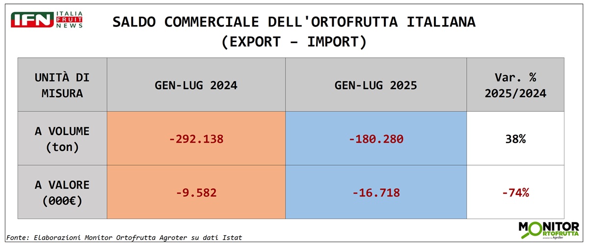 A luglio torna in rosso la bilancia commerciale dell’ortofrutta italiana: nei primi sette mesi dell’anno il saldo tra esportazioni e importazioni è negativo, con una perdita a valore di 17 milioni di euro, nonostante la ripresa rilevata a giugno (clicca qui per approfondire). Il dato più allarmante riguarda l’andamento complessivo: rispetto al 2024, il saldo a valore si è ridotto del 74%. Anche sul fronte dei volumi la situazione resta in rosso, con un deficit di 180 mila tonnellate, seppur in miglioramento del 38% rispetto all’anno scorso.