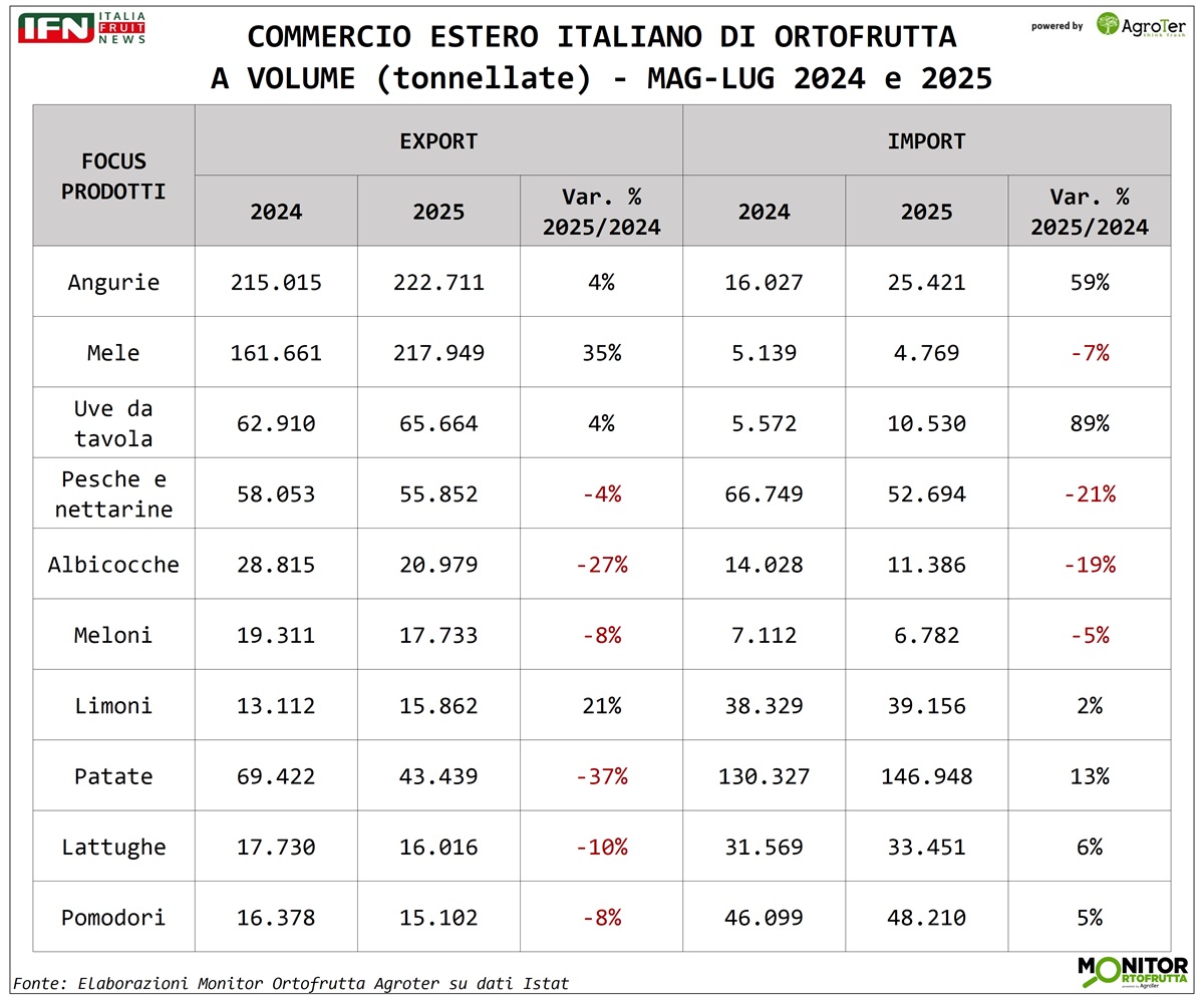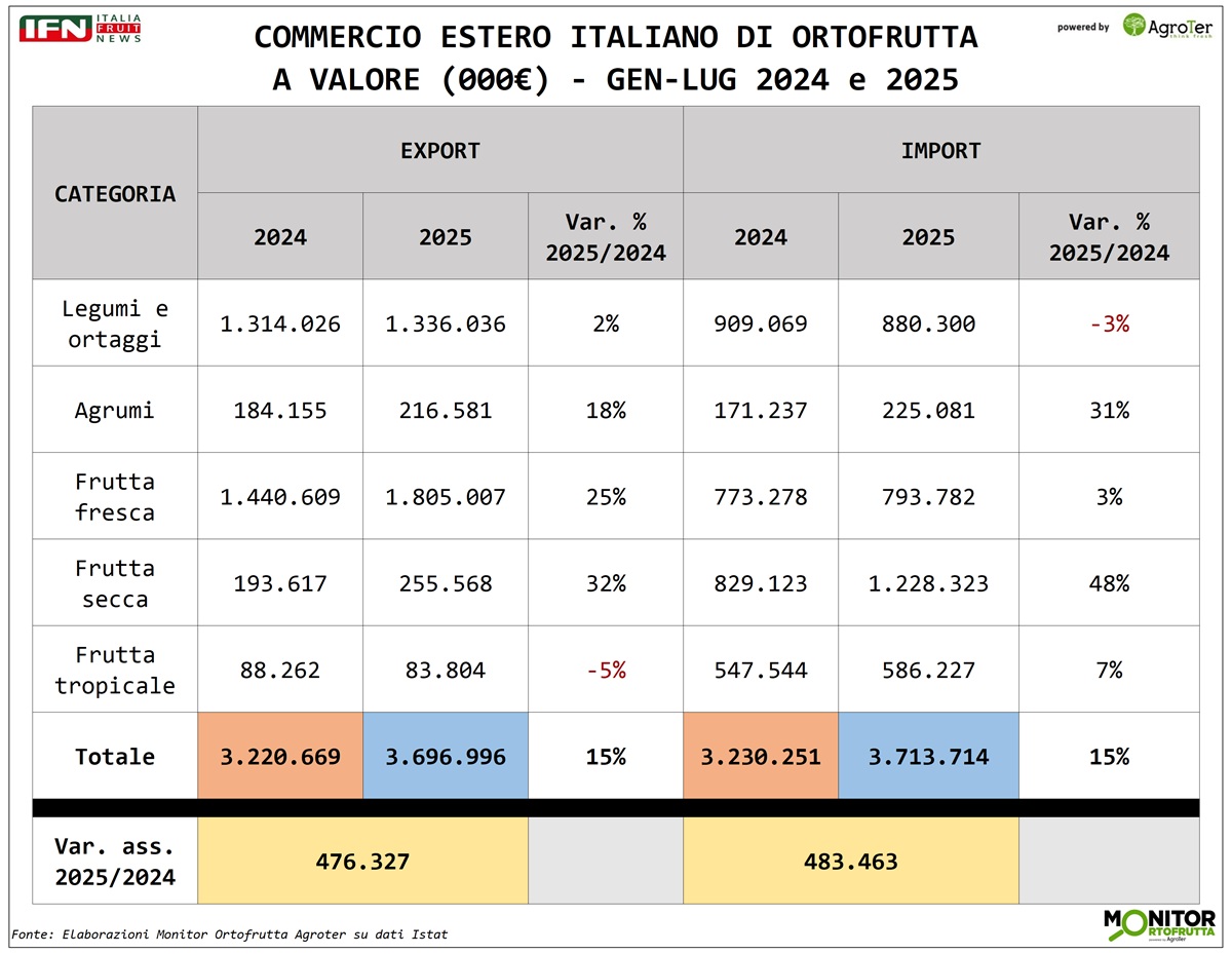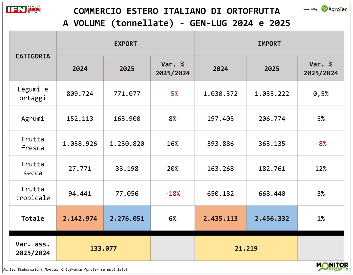 Le esportazioni mantengono un buon ritmo di crescita, con un aumento del 6% nei volumi e un incremento del valore del 15% rispetto all’anno precedente, a conferma delle quotazioni favorevoli ottenute sui mercati esteri. Le importazioni, invece, restano sostanzialmente stabili rispetto al 2024: i volumi crescono appena dell’1%, ma i prezzi più elevati all’origine hanno comportato un aumento della spesa complessiva di 15 punti percentuali. Sono questi i principali risultati dell’analisi del Monitor Ortofrutta di Agroter sui dati Istat aggiornati a luglio.