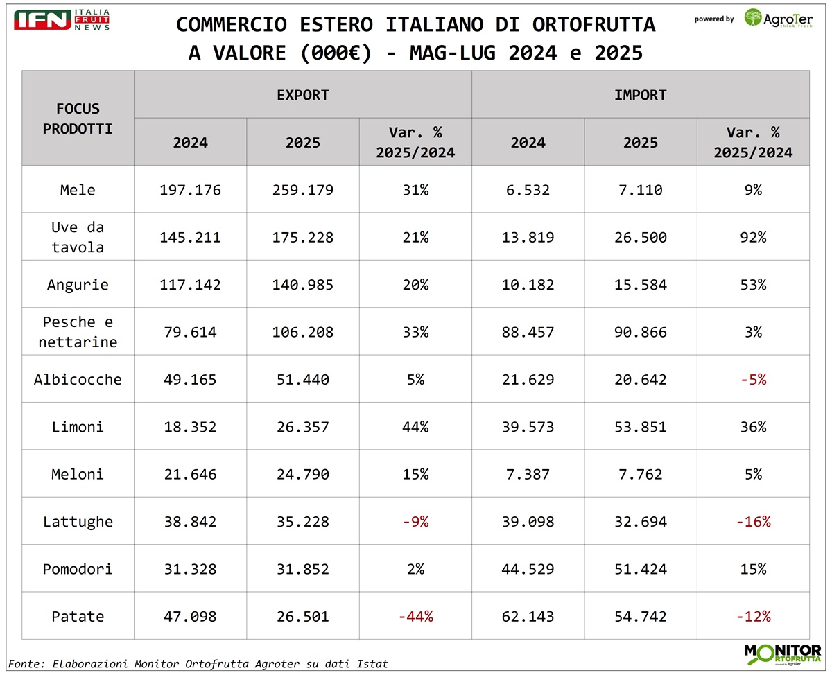 Tra le orticole, nel periodo commerciale maggio–luglio, tutti i principali prodotti mostrano un calo delle esportazioni: i volumi di patate si riducono del 37%, quelli di lattughe del 10% e di pomodori dell’8%. Le buone quotazioni sui mercati esteri, tuttavia, consentono di mantenere positivo il dato a valore per le esportazioni di pomodori (+2%).