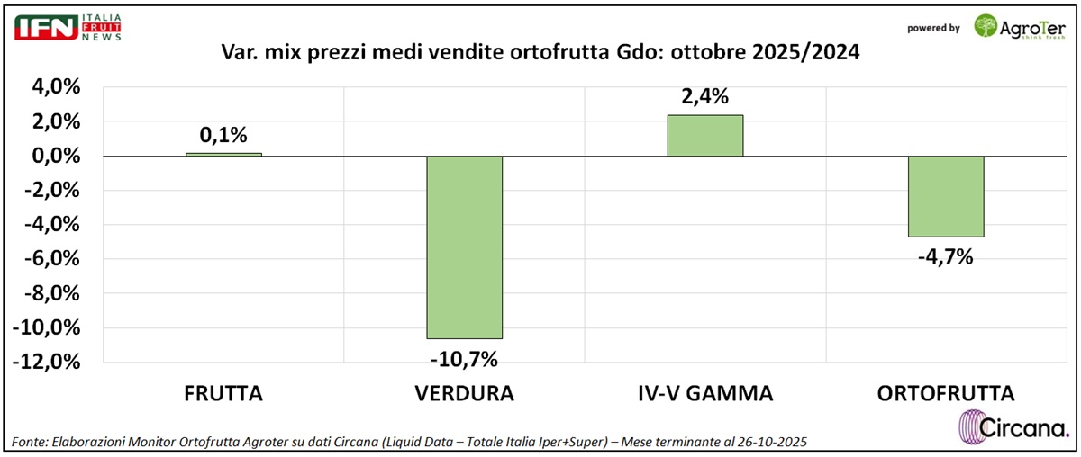 L’analisi del Monitor Ortofrutta di Agroter, in collaborazione con Circana, ci mostra come a ottobre i consumi del reparto ortofrutta siano cresciuti, mentre il fatturato ha registrato un calo. La flessione è dovuta soprattutto al forte ribasso del prezzo medio mix della verdura, non compensato dall’aumento dei volumi, mentre frutta e IV-V Gamma si mantengono più stabili.