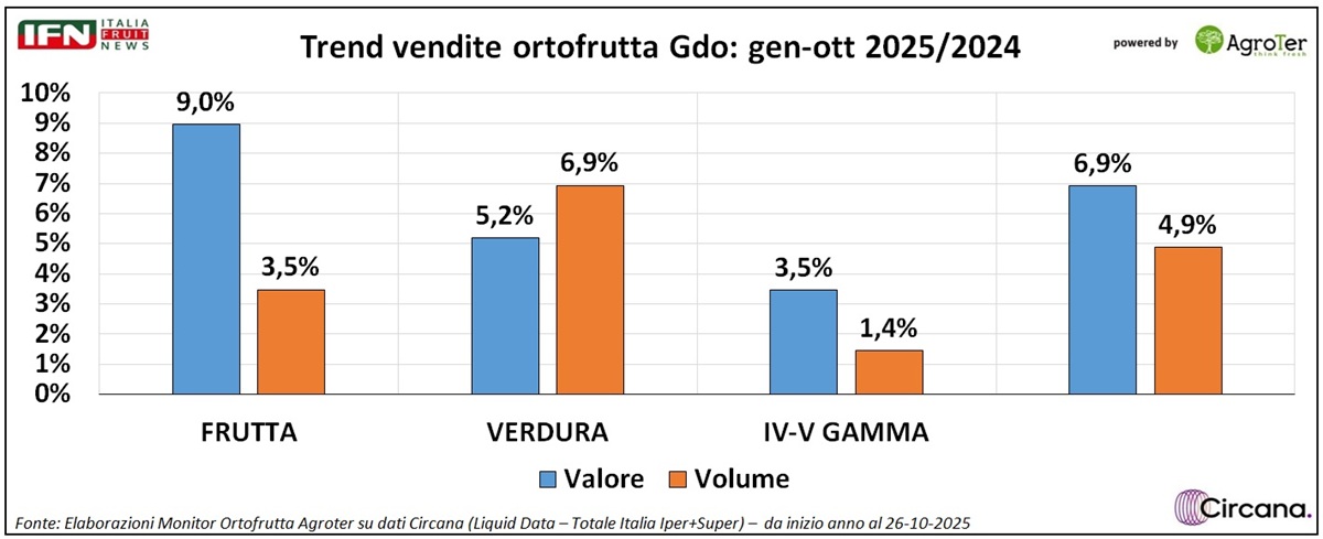 Il quadro generale resta comunque positivo sotto tutti i punti di vista. Nel periodo gennaio-ottobre, le vendite del reparto ortofrutta segnano una solida crescita: +4,9% a volume e +6,9% a valore. Tutte le macrocategorie chiudono in territorio positivo, con le verdure che guidano l’aumento dei volumi (+6,9%) e la frutta che si distingue per la performance a valore (+9%). Anche la IV-V Gamma mostra un andamento in crescita, seppure più contenuto, con +3,5% a valore e +1,4% a volume. (bf)