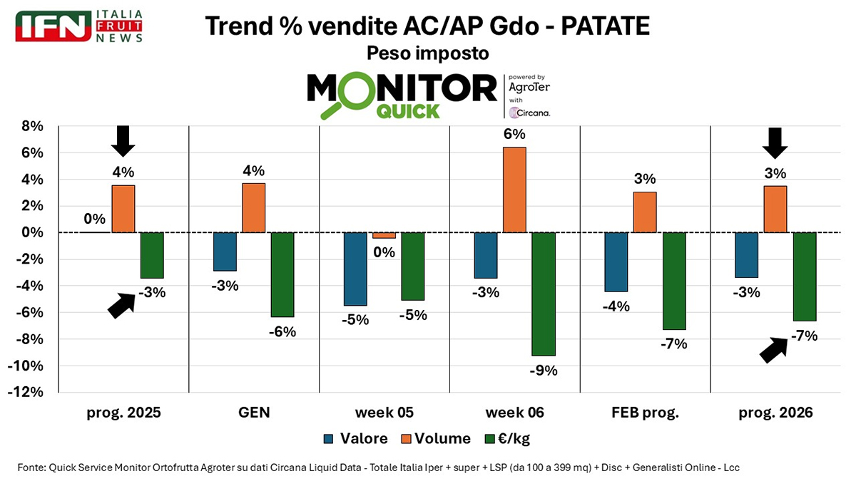 Una lettura che trova riscontro anche dal punto di vista della distribuzione. A confermarlo è Alberto Ancarani: “I numeri riflettono la realtà e, per quanto ci riguarda, in questo primo scorcio del 2026 stiamo migliorando, a dimostrazione di come quella delle patate sia una categoria in grande spolvero, in linea con quanto avviene anche per carote e cipolle, in una sorta di ‘back to basic’. Vediamo inoltre che all’interno della categoria crescono tutti i segmenti: oltre alle patate gialle, che restano il riferimento indiscusso, performano bene anche le rosse, le bianche, le mignon e le altre nicchie”.