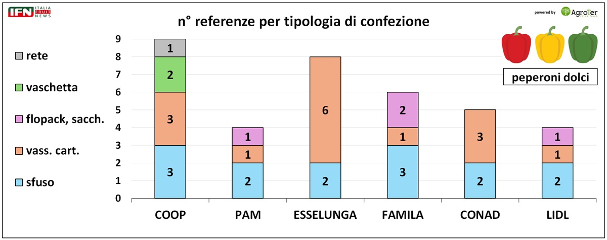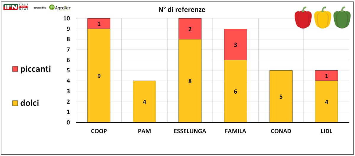 Nell’assortimento di peperoni prevale – come di consueto - la tipologia dolce, mentre quella piccante (che contiene capsaicina) è presente solo in quantità limitate, anche se nel Famila raggiunge le 3 referenze. Coop ed Esselunga offrono le gamme più ampie di peperoni dolci, con rispettivamente 9 e 8 referenze, mentre gli altri punti vendita propongono da 4 a 6 varianti.
