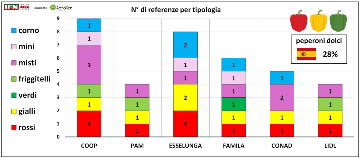Tra i peperoni dolci prevale l’origine italiana, ma il 28% delle referenze proviene dalla Spagna. I classici peperoni quadrati rossi e gialli sono sempre presenti e spesso con più opzioni di acquisto, mentre la variante verde è stata rilevata in un solo punto vendita. Diffusa anche la proposta di confezioni miste, spesso in più varianti (come nel caso di Coop e Conad). I friggitelli e i peperoni “mini” compaiono in tre negozi, mentre i peperoni corno, generalmente a marchio del fornitore e apprezzati per le loro qualità organolettiche, sono presenti in quattro punti vendita; Esselunga li offre in doppia versione.
