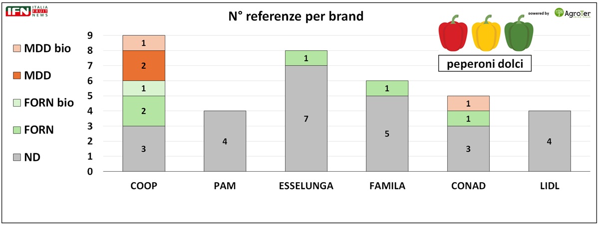 Elevata la presenza di prodotto confezionato, ma limitata quella dei brand: il 72% delle referenze risulta infatti privo di un marchio evidente. Solo Coop mostra una prevalenza di articoli a marchio del fornitore o Mdd, mentre negli altri punti vendita domina il prodotto anonimo, con rare eccezioni di referenze a marchio del fornitore, generalmente relative alla tipologia di peperone corno.