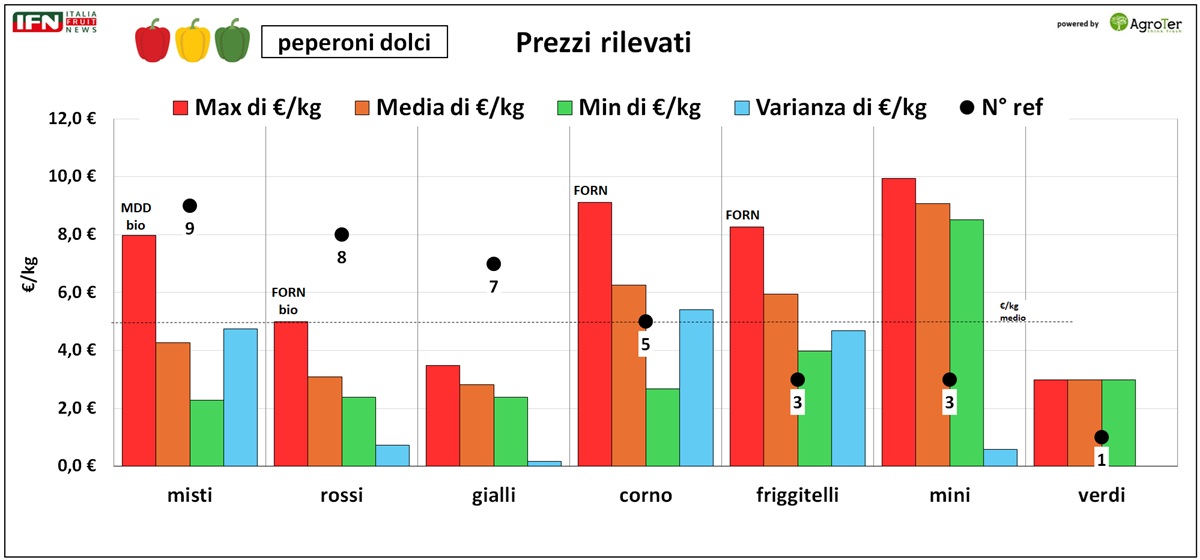 Le tipologie meno presenti evidenziano prezzi più elevati: i peperoni corno e i friggitelli si collocano intorno ai 6 €/kg, con un’ampia variabilità, mentre i peperoni “mini” raggiungono i valori più alti, circa 9 €/kg, ma con una variabilità minima. In alcuni casi si osservano picchi fino a 9-10 €/kg per prodotti del fornitore, in particolare nei corno e nei friggitelli, a conferma di come marchio e segmentazione possano incrementare il valore percepibile. (bf)