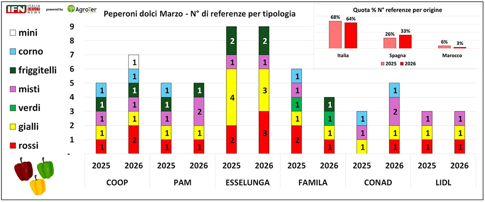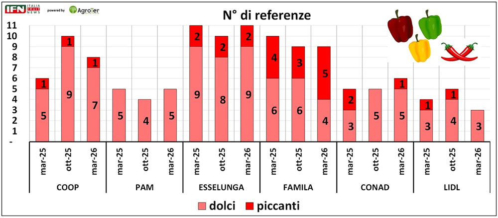 Più articolata e segmentata è invece l’offerta di peperoni dolci, che nei sei negozi analizzati evidenzia una certa variabilità in termini di ampiezza assortimentale. Nel 2026 Esselunga è l’insegna con la gamma più ampia, pari a 9 referenze, sostanzialmente in linea con il 2025. Segue Coop che, pur disponendo di maggior spazio espositivo potenziale, si attesta a 7 proposte nel 2026: un dato in crescita rispetto a marzo 2025 (5 referenze), ma in calo rispetto a ottobre dello stesso anno (9). Gli altri supermercati presentano assortimenti compresi tra 4 e 5 referenze, con una certa variabilità nelle tre rilevazioni, mentre Lidl si ferma a 3, confermando un’offerta più essenziale in linea col format discount.