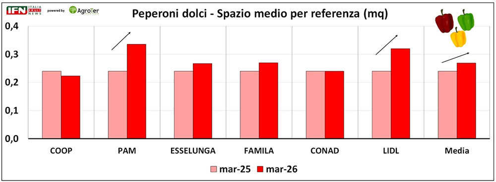 A marzo, tra il 2025 e il 2026, il numero di referenze di peperoni dolci registra un lieve aumento, passando da 31 a 33. Parallelamente cresce anche lo spazio medio destinato a ciascuna referenza, soprattutto in Pam e Lidl, e in misura più contenuta anche in Esselunga e Famila, mentre in Conad si osserva un dato costante e in Coop una leggera diminuzione. Rispetto ad altre categorie orticole, tuttavia, lo spazio medio dedicato ai peperoni dolci risulta leggermente sottodimensionato. Un dato che sembra riflettere la natura prevalentemente di servizio del prodotto e con una stagionalità poco accentuata, e una logica di acquisto programmato.