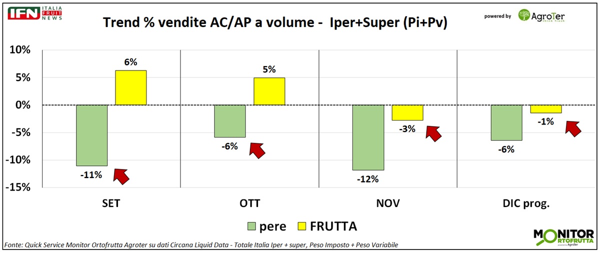 Le pere rientrano tra le categorie dell’ortofrutta che stanno incontrando maggiori difficoltà, sia negli ultimi anni sia nella fase iniziale e centrale dell’attuale campagna. Da settembre in poi, le vendite in ipermercati e supermercati risultano costantemente negative, con un picco critico a novembre, quando i volumi registrano un calo del 12%. A dicembre si osserva una lieve ripresa nel progressivo (-6%), a fronte però di un aumento contenuto del prezzo medio mix e nell’ordine di 2-3 punti tra ottobre, novembre e dicembre.