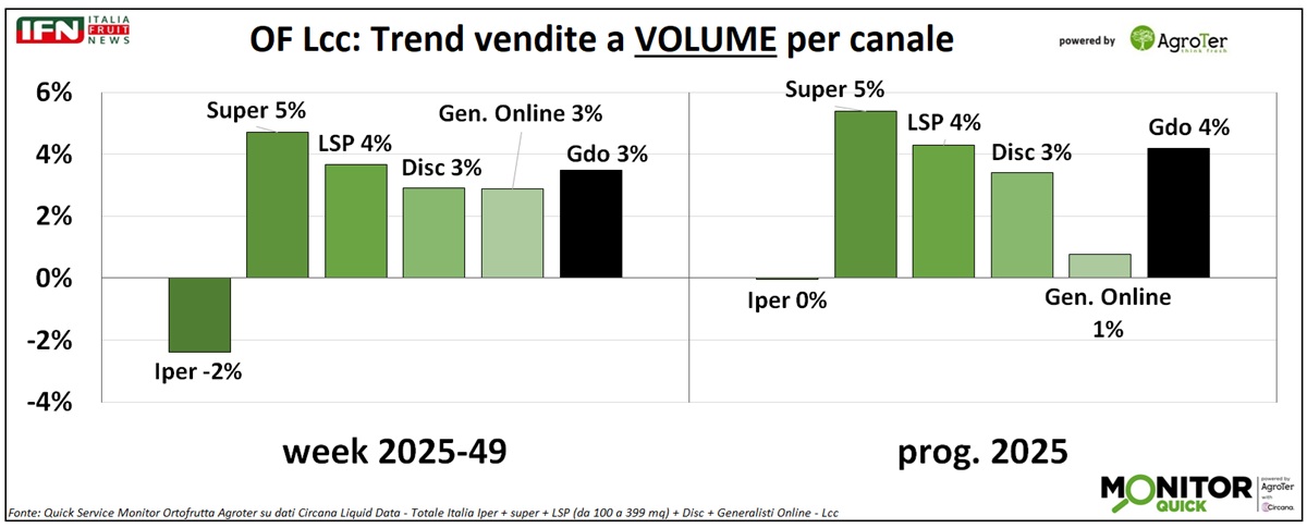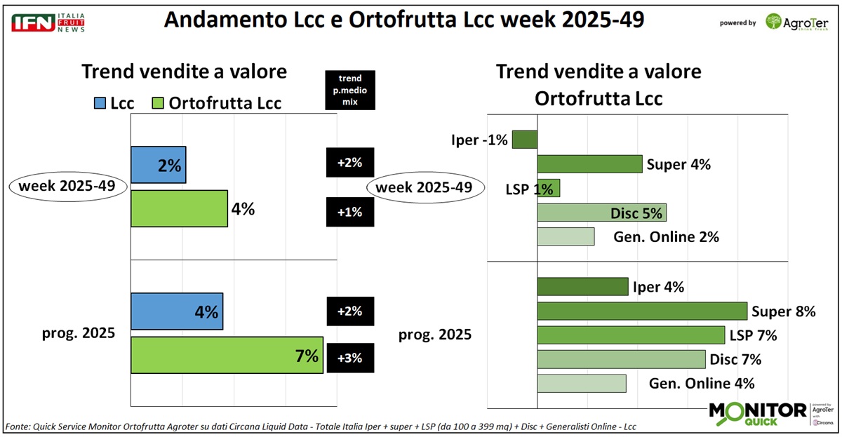 La settimana 49, conclusa domenica 7 dicembre, segna finalmente una ripresa dopo un novembre negativo, con vendite dell’ortofrutta Lcc in crescita. Il risultato è positivo anche a livello di canali distributivi, con la sola eccezione dell’ipermercato, che registra una flessione. All’interno del reparto ortofrutta, tuttavia, le pere mostrano ancora criticità in questa fase centrale della campagna, con performance costantemente inferiori rispetto all’andamento complessivo della frutta.