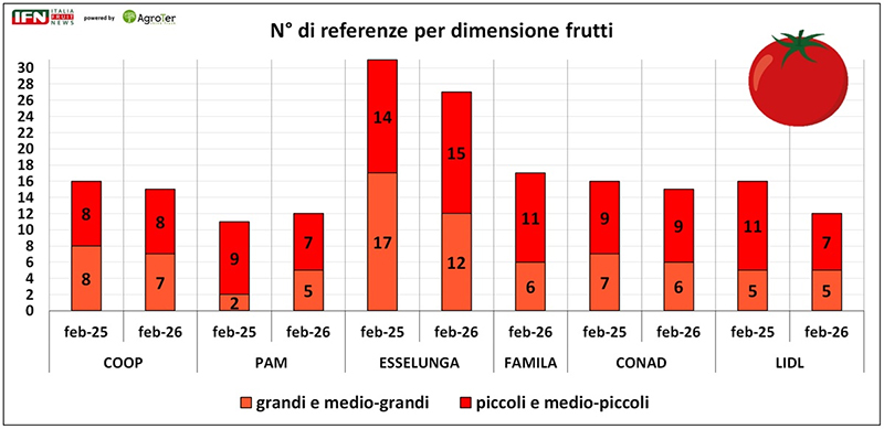 Come primo parametro di segmentazione dell’offerta abbiamo considerato, come sempre, la dimensione della bacca, poiché fornisce una prima direzione sulle preparazioni più adatte, distinguendo tra pomodori medio-grandi o grandi e pomodori medio-piccoli o piccoli. Nel complesso, il rapporto tra i due segmenti rimane invariato rispetto al 2025, con una prevalenza dei formati piccoli e medio-piccoli (57%), anche se l’analisi per insegna evidenzia alcuni cambiamenti. Coop e Conad mantengono sostanzialmente l’equilibrio dell’anno precedente, con 6-8 referenze di pomodori grandi e 8-9 di piccoli. Pam aumenta invece i grandi (da 2 a 5) ma riduce i piccoli (da 9 a 7), mentre Lidl registra un calo più marcato dei piccoli (da 11 a 7) lasciando invariato l’assortimento dei grandi a 5 referenze. Esselunga, infine, amplia leggermente l’offerta dei pomodori piccoli (da 14 a 15), alleggerendo però quella dei grandi (da 17 a 12).