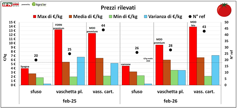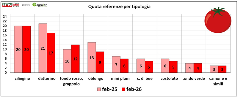 Il rilevamento di febbraio 2026 nei sei punti vendita della piazza di Parma è stato utile anche per tentare di confrontare le referenze di pomodoro di alta qualità — il cosiddetto premium — con quelle identificate sulla stessa piazza nel 2025. La prima difficoltà è stata proprio identificarle: la selezione effettuata va infatti un po' oltre le conoscenze della “signora Maria” e mette in luce un segmento che, rispetto al 2025, non mostra una crescita significativa in termini di presenza a banco. Tra le tipologie prevalenti si arresta il datterino, mentre fanno la loro comparsa alcune referenze premium di tondo liscio rosso.