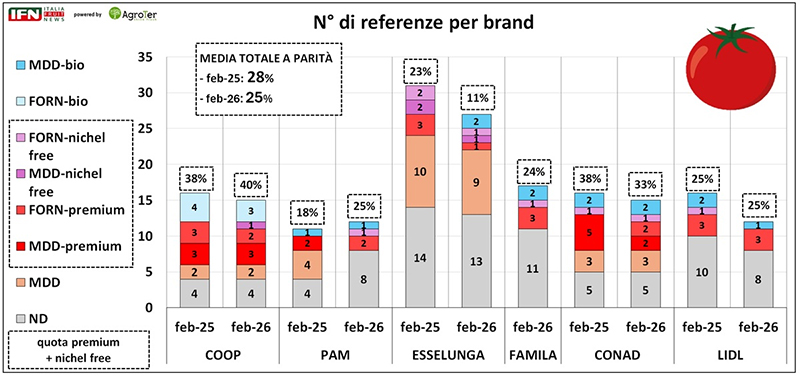 A livello generale, sia includendo Famila — rilevato solo nel 2026 — sia escludendolo dal confronto, l’incidenza delle referenze premium da noi identificate risulta in calo rispetto al 2025, passando dal 28% al 24-25%, con differenze ancora piuttosto marcate tra insegne. Il calo non è drastico, ma è un indicatore che può fornire informazioni utili, anche se la più importante è la difficoltà agli occhi del cliente nell’identificare distintamente i pomodori di alta qualità.