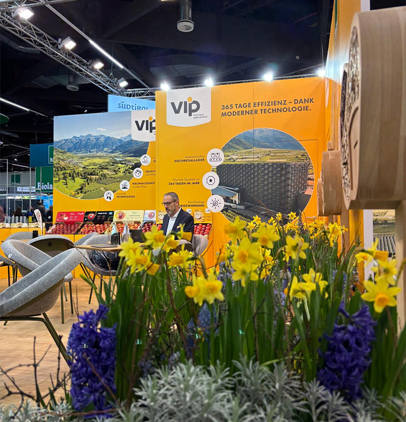 Oltre ad una forte attenzione verso l’innovazione tecnologica, i sistemi di coltivazione VIP si concentrano molto sul tutelare la biodiversità negli ecosistemi dei meleti della Val Venosta, come viene raccontato dallo stand presentato quest’anno in fiera. Grazie ad un’installazione ricca di fiori e con molti richiami al ricco habitat naturale della valle, VIP racconta un impegno costante che si traduce in misure concrete per la tutela dell’ambiente. L’impegno verso la protezione della biodiversità viene anche monitorato tramite la rilevazione ELLA, basata sul questionario sull’habitat frutteto, elaborato insieme al Centro di Consulenza per la Fruttiviticoltura dell’Alto Adige e ai produttori biologici VIP.