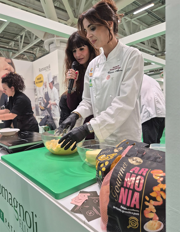 Durante lo show cooking, Valentina Alunno ha realizzato dal vivo due preparazioni che hanno saputo raccontare in modo concreto la versatilità delle due varietà: una vellutata di patate, cremosa e avvolgente, e delle polpette di patate, fragranti e ricche di gusto. Ricette semplici solo in apparenza, capaci di valorizzare struttura, sapore e qualità della materia prima, dimostrando come Monique e Melrose possano diventare protagoniste sia della cucina quotidiana sia di proposte gastronomiche più evolute. Le degustazioni finali, offerte al pubblico presente, hanno raccolto apprezzamenti unanimi, confermando il crescente interesse del mercato per prodotti ortofrutticoli orientati al segmento gourmet, in grado di coniugare piacere sensoriale, praticità d’uso e identità varietale.