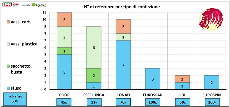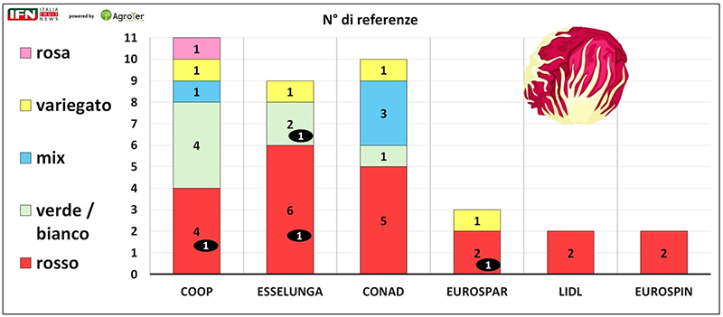 L’analisi del numero di referenze fa emergere ruoli differenti assegnati alla categoria dei radicchi: le tre insegne Coop, Esselunga e Conad presentano assortimenti ampi e profondi, dalle 9 alle 11 referenze, mentre i discount e Eurospar mantengono una proposta molto più essenziale (2-3 opzioni).