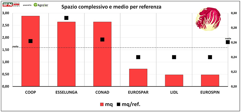 Anche nello spazio dedicato emerge una netta differenza tra i negozi con assortimenti più profondi e quelli più essenziali: i primi riservano ai radicchi sia uno spazio complessivo sia uno spazio relativo più ampio, soprattutto Esselunga, mentre i secondi (Eurospar, Lidl ed Eurospin) li trattano come prodotto di servizio, assegnando il minimo indispensabile. In generale, l’esposizione risulta spesso frammentata, con referenze e sottofamiglie distribuite in punti diversi anziché raggruppate in un’unica area.