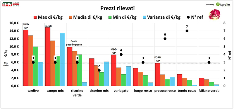 Chiudiamo, come di consueto, con l’analisi dei prezzi medi, ordinando le diverse tipologie di radicchio in base al prezzo medio decrescente, considerando solo quelle con almeno due referenze rilevate. Nel complesso, la categoria presenta livelli di prezzo elevati, con una media generale prossima ai 6 €/kg.