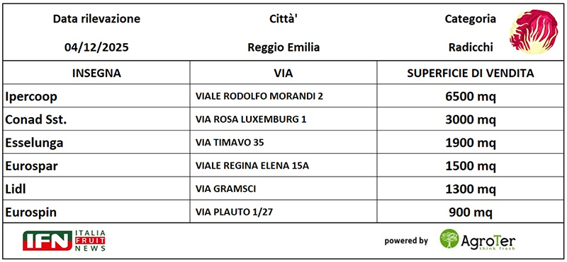 Con la rilevazione svolta a inizio dicembre in sei insegne della Gdo di Reggio Emilia abbiamo approfondito la categoria dei radicchi, un segmento dal forte potenziale che presenta strategie assortimentali molto differenti fra i retailer e un’esposizione spesso frammentata. La diffusione di prodotto sfuso e di confezioni senza brand mette in luce un ampio margine di crescita nella valorizzazione delle referenze, soprattutto considerando che il prezzo medio risulta sensibilmente più alto rispetto alla maggior parte delle altre verdure.