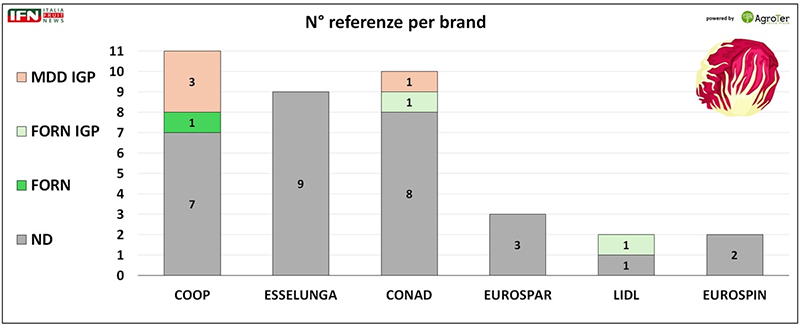 Come spesso accade, una forte presenza di prodotto confezionato comporta una segmentazione piuttosto semplice dal punto di vista dei brand. Nel caso del radicchio ciò è ancora più evidente: l’insegna che offre il maggior numero di confezioni, Esselunga, non propone marchi specifici se non quelli legati alla propria linea “prezzi corti”.