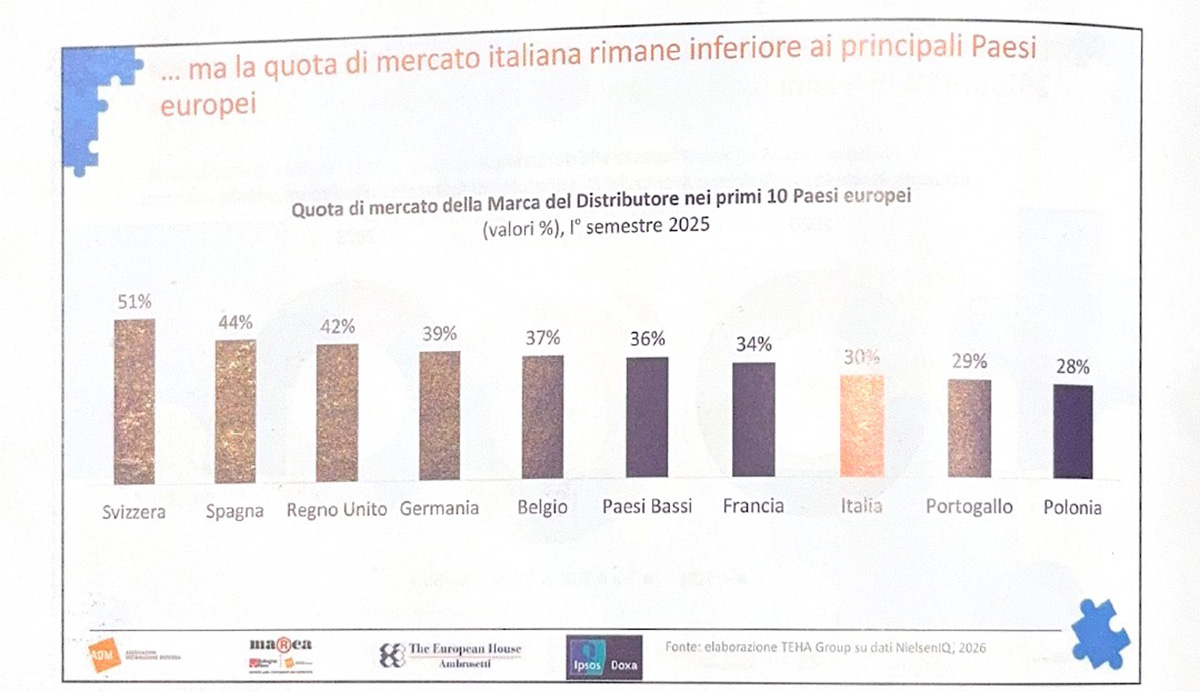 In questo scenario, la Marca del Distributore (Mdd) riveste un ruolo centrale: 9 italiani su 10 dichiarano di fidarsi dei suoi prodotti, prodotti che negli ultimi anni hanno contribuito a tutelare il potere d’acquisto delle famiglie, generando risparmi per circa 22 miliardi di euro dal 2020 a oggi, pari a circa 150 euro l’anno per nucleo familiare. Attualmente la quota della Mdd in Italia si attesta al 30%, in ulteriore crescita rispetto al 2024, pur rimanendo ancora al di sotto dei livelli raggiunti nei principali Paesi europei.