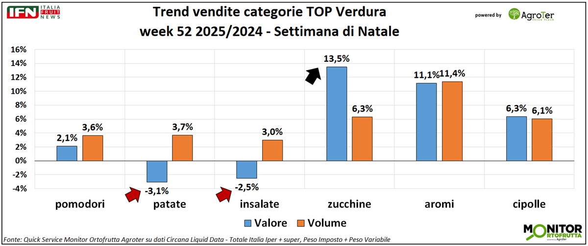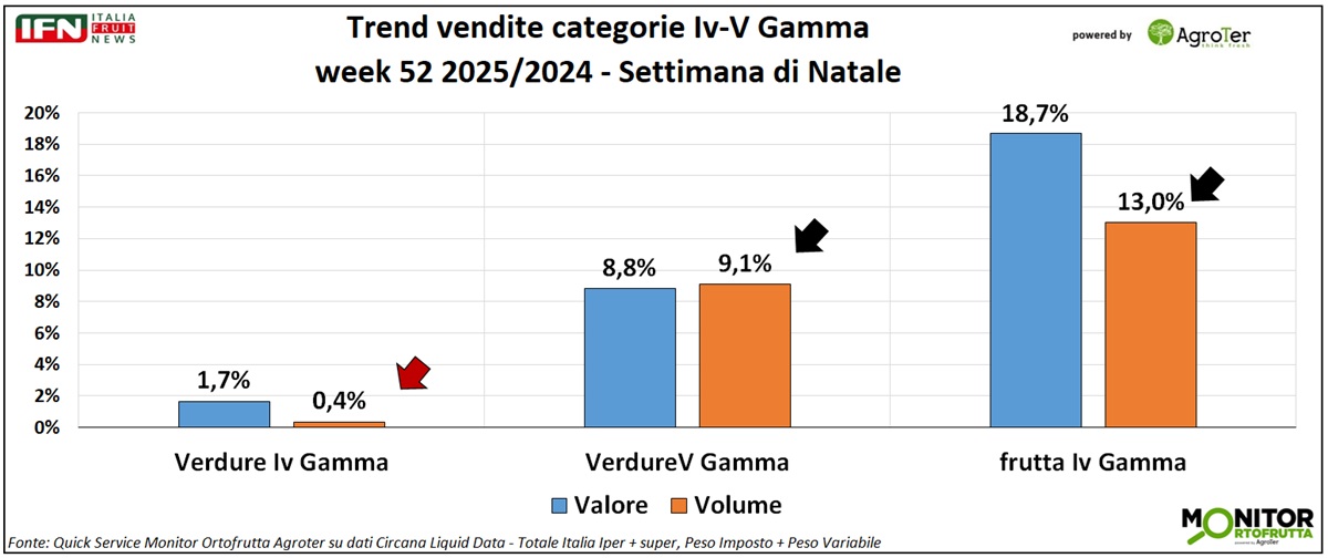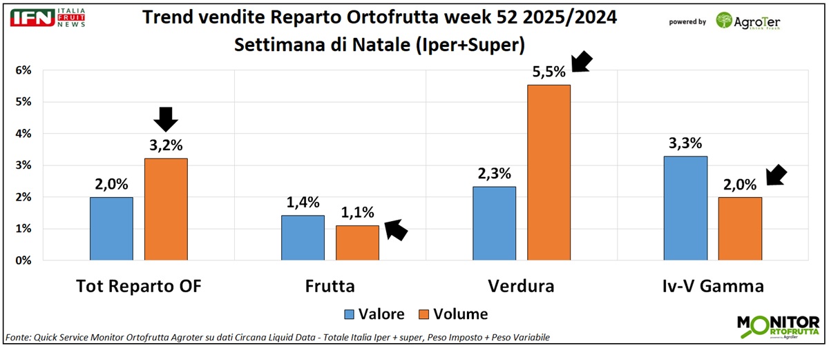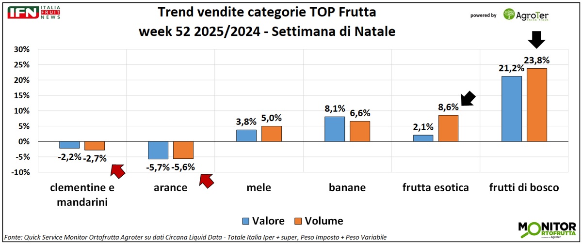 Nella settimana di Natale, le performance del reparto ortofrutta di ipermercati e supermercati risultano complessivamente soddisfacenti: aumentano i volumi e crescono anche i valori, nonostante una lieve flessione del prezzo medio mix. Il calendario, a parità di condizioni, non presenta disallineamenti legati alle festività tali da alterare il confronto dei dati con l'anno precedente. Tra le principali categorie frutticole per vendite, spiccano i frutti di bosco, seguiti dalla frutta esotica e dai prodotti tradizionali del comparto, come mele e banane; in difficoltà, invece, gli agrumi.