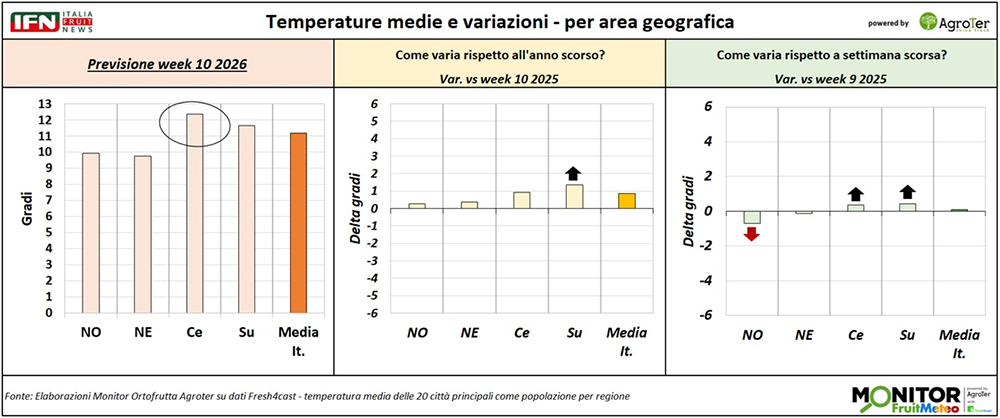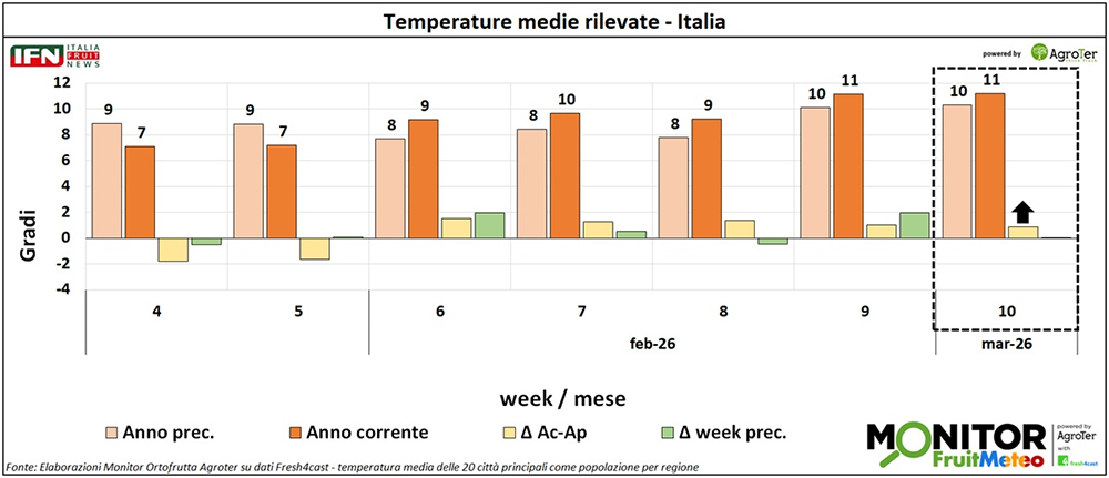 Le analisi del Monitor Ortofrutta si arricchiscono grazie a una nuova collaborazione dedicata a esplorare settimanalmente una variabile spesso decisiva per il settore ortofrutticolo: il meteo. Tra i diversi fattori che influenzano le condizioni climatiche, questa nuova rubrica si concentra in particolare sulle temperature medie registrate lungo la Penisola, con il supporto di Fresh4cast, una piattaforma software in cloud specializzata nella previsione della domanda e nell'ottimizzazione della supply chain per il settore ortofrutticolo.