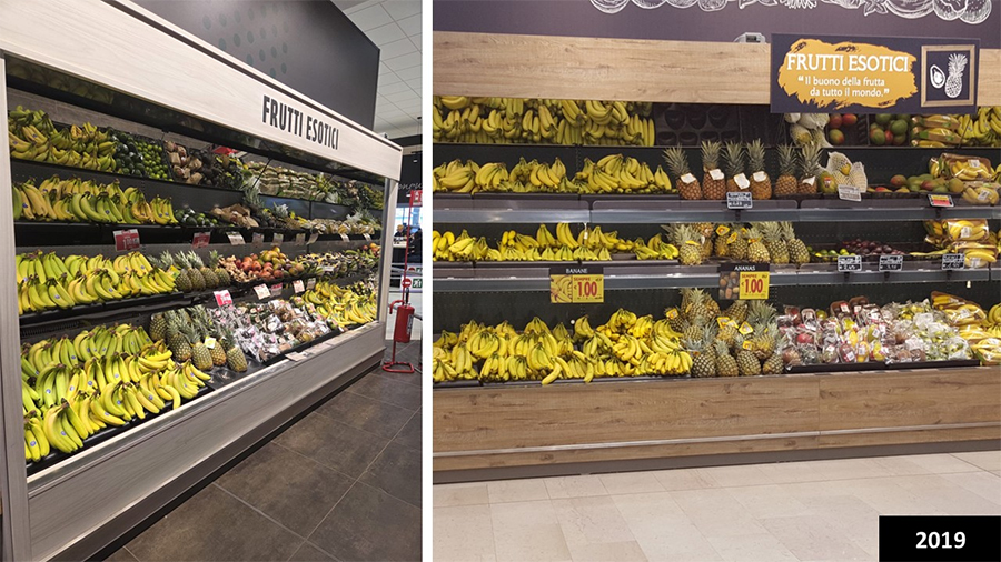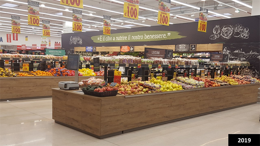 Nel format del 2019 emergeva una forte enfasi sulla convenienza, espressa attraverso numerosi cartelli sospesi, in cui il giallo e il rosso mettevano in risalto l’ortofrutta proposta a 1 euro. Il messaggio risultava immediato e incisivo, inserito in uno stile comunicativo curato, capace di segmentare le categorie e di moltiplicare i punti di attrazione visiva. Ne derivava un reparto ortofrutta di grande impatto, ma caratterizzato da una tale densità di messaggi da rendere non sempre agevole una lettura completa e immediata dell’insieme.