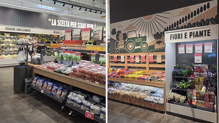 Anche la realizzazione appare essenziale, ma immediata e ben percepibile: contribuisce a rendere l’esperienza d’acquisto più rilassata, grazie a una logica che punta maggiormente sull’identificazione dei segmenti di prodotto. Ne risulta un reparto dal tono più caldo e valoriale, che non parla soltanto di acquisto di frutta e verdura, ma richiama uno stile di vita improntato a benessere e naturalità.
