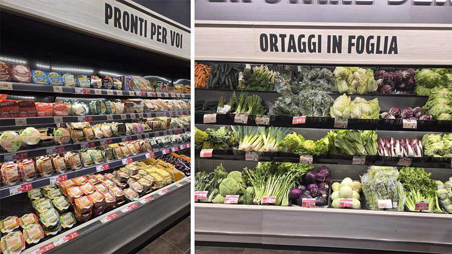 Resta centrale il messaggio di apertura dedicato alla salubrità, sempre nel reparto ortofrutta all’entrata del negozio. In precedenza veniva espresso con il claim “È il cibo a nutrire il nostro benessere”: una formula morbida, istituzionale e positiva, ma generica, che comunicava un valore condivisibile senza assumere una posizione particolarmente forte o concreta. Nel 2026, invece, il tono cambia con messaggi come “È il cibo la prima medicina del corpo” e “La scelta per stare bene è mangiare bene”, più diretti, incisivi e coinvolgenti. Il focus si sposta così dal benessere come concetto astratto al benessere come scelta consapevole, passando da un registro istituzionale a uno più motivazionale.