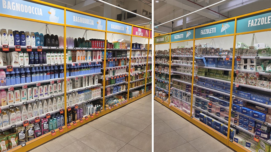 La rivisitazione del concept interessa anche altri reparti, in particolare quelli in cui l’obiettivo è offrire al cliente una guida concreta per orientarsi nel punto vendita. L’ampliamento degli assortimenti, che negli anni ha interessato in modo esponenziale numerose categorie, ha infatti reso sempre più complessa l’individuazione dei prodotti desiderati. Ne è un esempio, in questo senso, l’area “cura persona”, dove la comunicazione posta sopra lo scaffale aiuta a individuare i prodotti in base alla funzione d’uso o all’occasione di utilizzo.