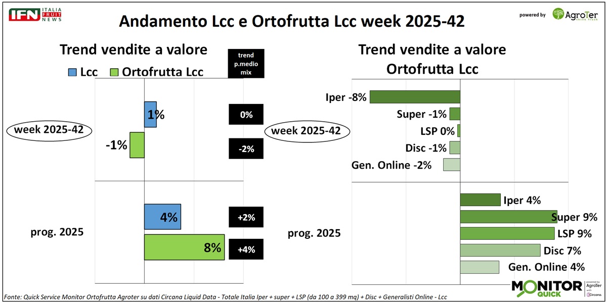 Nella week 42, l’ortofrutta Lcc resta in territorio positivo (+1% a volume) con prezzo medio mix in flessione
