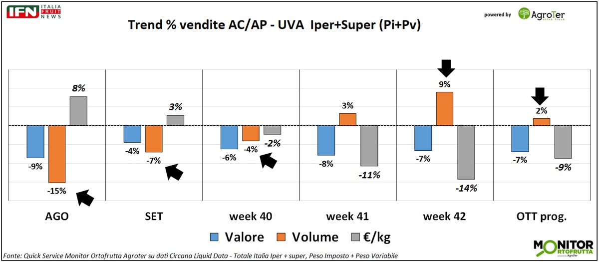 Ad ottobre, la campagna dell’uva da tavola è ancora nel vivo, considerando che sviluppa circa un quinto dei volumi complessivi nel canale di ipermercati e supermercati. Tuttavia, l’avvio non è stato sicuramente dei migliori: ad agosto i volumi sono calati del -15% rispetto all'anno precedente, così come a settembre, anche se di con intensità inferiore (-7% a volume). Le situazione migliora solo a partire dalla seconda settimana di ottobre, quando le vendite riprendono fiato (+3% a volume), favorite da una deflazione marcata (-11%). Il trend positivo si consolida nella settimana 42, con prezzi ancora in calo (-14%) e volumi in crescita (+9%). Nonostante ciò, il bilancio a valore del mese rimane negativo (-7%).