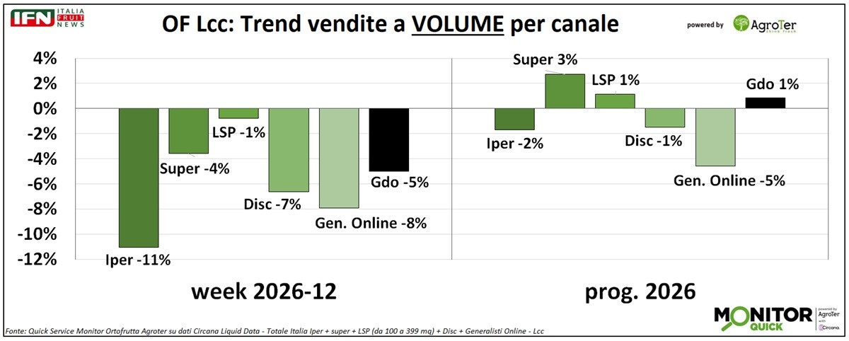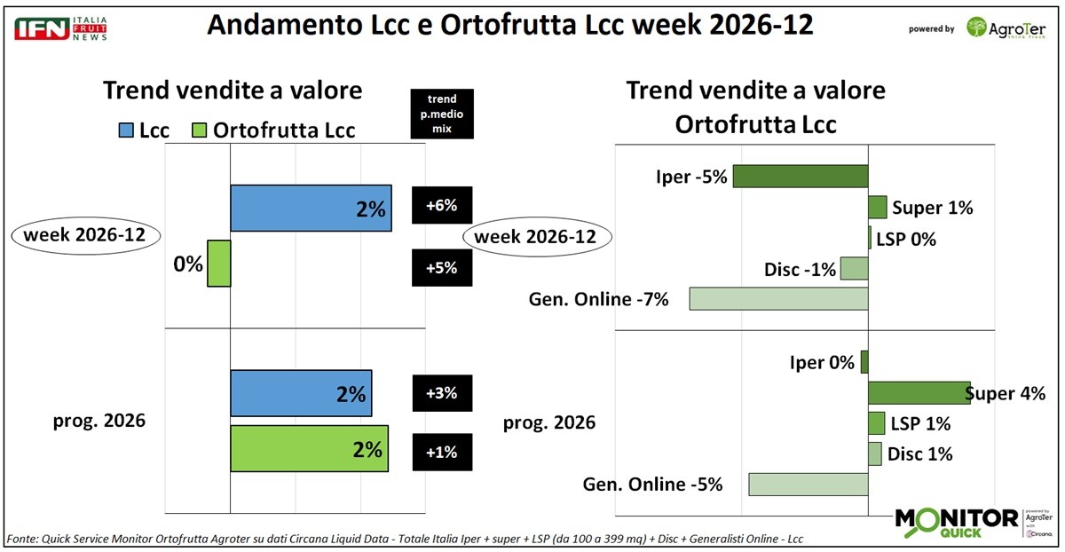 Settimana 12 ancora in calo per le vendite di ortofrutta Lcc, con un peggioramento rispetto alla rilevazione precedente. Nessun canale di vendita mostra segnali positivi e solo il libero servizio limita le perdite, avvicinandosi al pareggio. A frenare la domanda è anche il deciso aumento del prezzo medio mix, che incide soprattutto su alcune categorie. Tra queste le zucchine, protagoniste di un cambio di scenario netto: dopo un 2025 segnato da deflazione e crescita dei volumi, il primo trimestre si chiude con quantità in flessione e prezzi in forte rialzo.